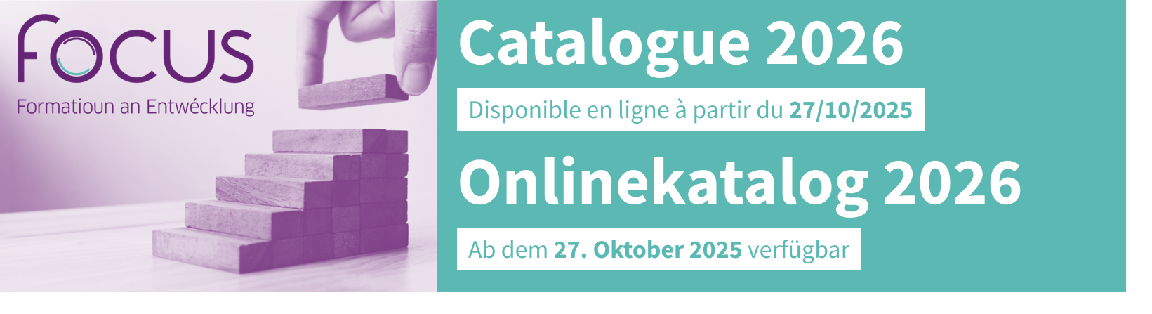FOCUS-INSCRIPTION EN LIGNE Besoin d’une formation ou d’un accompagnement sur mesure ? Contactez-nous Brochure Champ d'action Tous Orientation pédagogique Développement de l’enfant & du jeune Approches & méthodologies pédagogiques Emotions & relations sociales Valeurs, participation & démocratie Langue, communication & médias Esthétique, créativité & art Mouvement, Conscience corporelle & santé Sciences & technique Transitions Management & cadre réglementaire Sécurité & santé au travail AEF - Fondamentaux AEF AEF - Renforcement de la posture professionnelle AEF - Concept d’action AEF - Management & travail en équipe Mot clé ou référence Public cible Tous Assistants Parentaux Familles d’Accueil PE PE+DI DI+AD PE+CU ST Ville Toutes ASPELT BEAUFORT BELVAL BELVAUX BISSEN BIWER CENTRE COLMAR BERG CONTERN DIEKIRCH DUDELANGE ECHTERNACH ERPELDANGE SUR SÛRE ESCH SUR ALZETTE FOUHREN GREVENMACHER HOBSCHEID HOLLENFELS HOLLERICH HOSINGEN KIRCHBERG LAROCHETTE LUXEMBOURG LUXEMBOURG KIRCHBERG MANTERNACH MARNACH MEDERNACH MERSCH NEIHAISCHEN NIEDERANVEN NOCHER NORD OBERANVEN OBERFEULEN ONLINE ONLINE ET PRESENTIEL ROOST STEINFORT SUD TANDEL VIANDEN VILLE HAUTE LUXEMBOURG WALFERDANGE WILTZ Date de début Date de fin Langue Toutes FR DE LU EN Affiner les formations Formation (57) Public cible Langue Date et lieu de la prochaine session « Zurück 1 2 3 4
